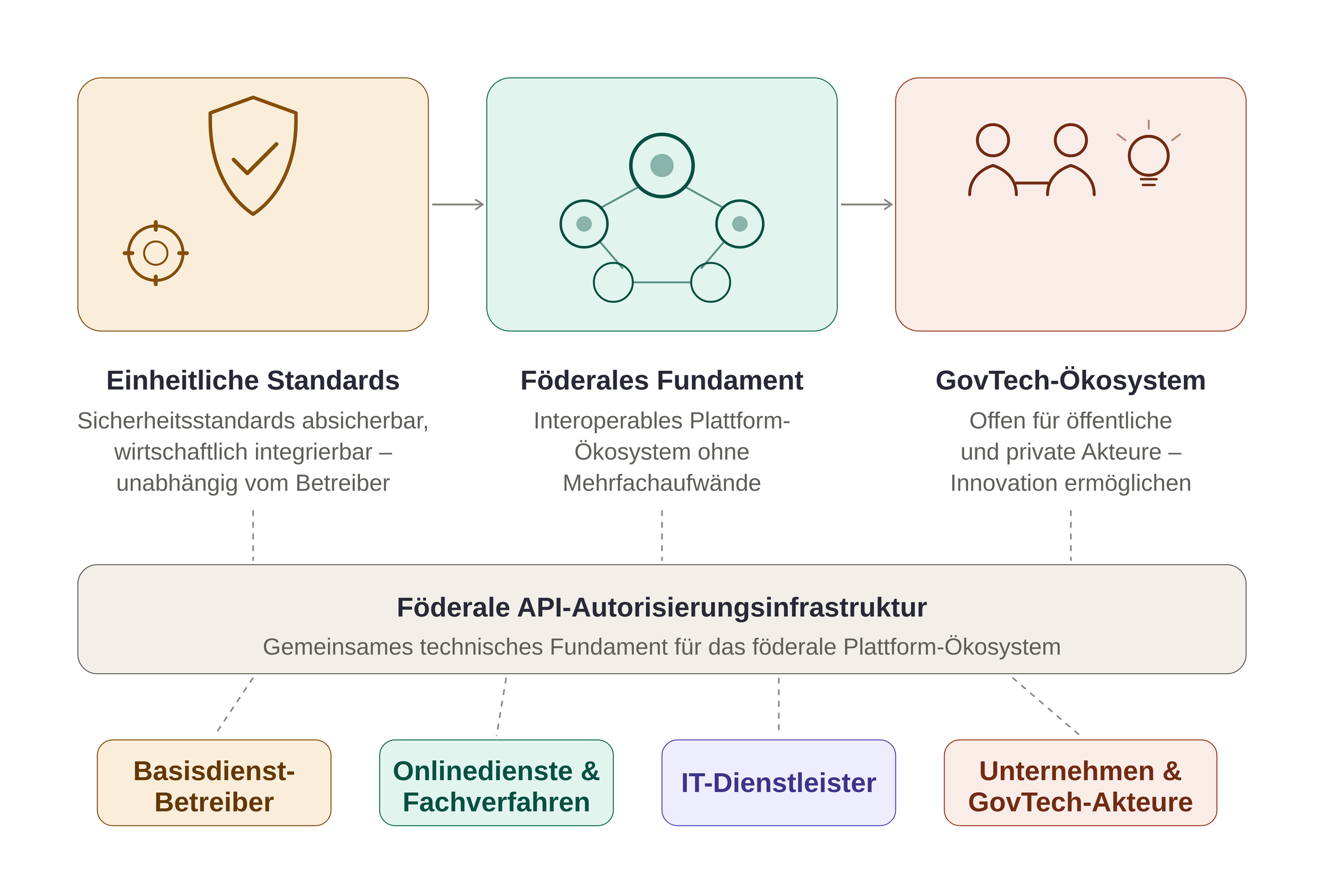 Die Vision der Zielarchitektur: Föderale Basisdienste sind nach einheitlichen Sicherheitsstandards absicherbar und wirtschaftlich integrierbar – unabhängig davon, wer sie betreibt oder nutzt. Die gemeinsame Autorisierungsinfrastruktur steht öffentlichen IT-Dienstleistern und privaten Unternehmen gleichermaßen offen und wird so zur Grundlage eines lebendigen GovTech-Ökosystems.